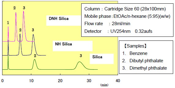 ? ?DNH硅膠鍵合的二元胺和一元胺是NH硅膠的2倍?;谶@個原因,DNH硅膠的堿度要比NH硅膠強(qiáng),并且由于碳鏈較長,DNH硅膠的氫鍵作用要比NH硅膠弱一些。因此,DNH硅膠的流動相要選擇極性小的溶劑,因為DNH硅膠的洗脫速度要比普通的裸硅膠和NH硅膠快。