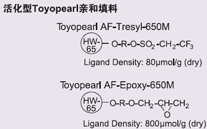 ?????? Toyopearl AF-Epoxy-650M活化型填料,也是干燥包裝,具有高密度的環(huán)氧基團(tuán)(ca. 800μmol/ml)。在適當(dāng)?shù)姆磻?yīng)條件下,可用于固定蛋白質(zhì)或低分子配體。當(dāng)結(jié)合高密度低分子配體時(shí)特別有效。例如,谷胱甘肽和甘氨酸的耦合密度可達(dá)到大于100μmol/ml濕狀填料。Toyopearl AF-Epoxy-650M是一種多功能的原材料,可連接其他特殊應(yīng)用所需的化學(xué)活性基團(tuán)。這種填料可輕松被激活為含有酰肼的物質(zhì)。這對固定碳水化合物或糖蛋白特別有用。