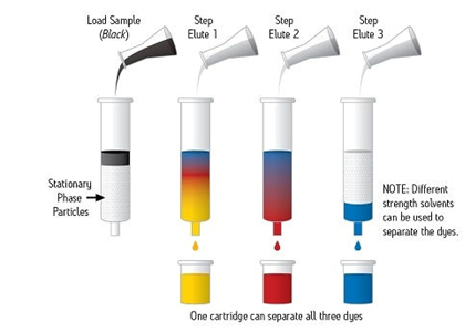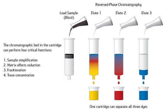 SPE通常是一種使用裝在柱芯型裝置內(nèi)的固體顆粒和色譜填充材料對樣品中的不同組分進行化學分離的樣品制備技術。樣品幾乎始終呈液態(tài),但特殊應用項目可能使用氣相中的某些樣品進行。圖1顯示出一份樣品(圖示為黑色)正在使用SPE裝置進行處理,以使組成該樣品的每種染色組分通過色譜分析實現(xiàn)分離。