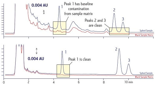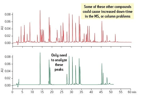 另一種考慮是存在于樣品基質中的各種干擾物在每次進樣時可能會蓄積導致儀器停機。如果這些干擾物能在樣品制備期間被除去,那么目標化合物就能使用一種更簡單、更穩(wěn)定的方法進行分析(圖3)。此圖將位于靠上位置的原始樣品與位于靠下位置的經(jīng)SPE制備后的新樣品進行了比較。