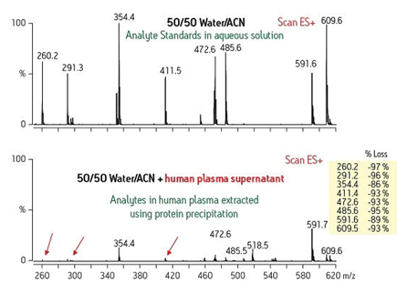 復雜樣品基質帶來的第二種問題在我們觀察質譜輸出圖譜(LC/MS或LC/MS/MS)時可以看到。為了獲得適當?shù)馁|譜響應信號(靈敏度),必須使該化合物離子化。如果該化合物離子的形成因樣品基質干擾物而受阻,那么相應的信號強度也會大大減弱。