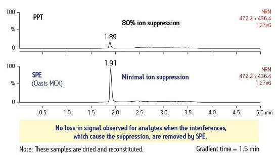 在有些情況下,源自樣品基質的干擾物可能會增加某種化合物的信號,這叫做離子增強,可導致響應值偏高。適當?shù)腟PE方法可通過將干擾物與該化合物分離開來而最大限度減弱這種效應,從而使響應值更準確。