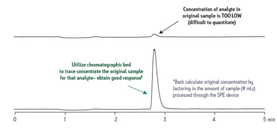 分析環(huán)境樣品中的痕量污染物或者代謝物在生物液體內(nèi)隨時間的變化情況就是一個可以說明這一點的較好例子。圖9中靠上的圖譜表明使用原始純樣品進行分析時,目標化合物的信號響應差。通過以SPE作為痕量濃縮策略制備樣品后再使用相同的分析條件進行分析后所獲得的靠下的圖譜表明這種化合物的信號強度顯著提高。根據(jù)這一結果,我們可以準確計算出純樣品中的原始化合物濃度。
