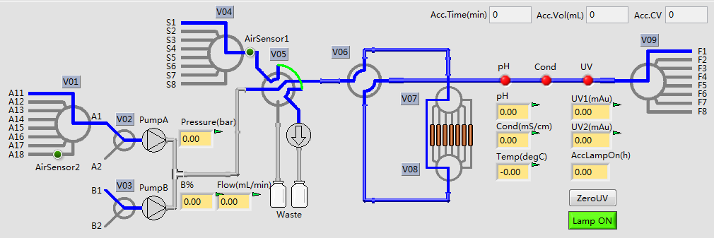 6、全自動(dòng)柱流向切換閥門(mén),可實(shí)現(xiàn)層析柱正、反向流動(dòng)及旁路功能;