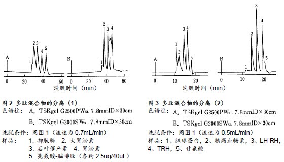 ??? 圖2、3所示為TSKgel G2500PWXL與TSKgel G2000SWXL在分離多肽標準品時的對比圖。通過色譜圖可以明確的看出,TSKgel G2000SWXL吸收峰形與分離帶的寬度均更佳,因此其分離性能更為優(yōu)異。另一方面,如果多肽的分子量小于1000,由于樣品與填充劑之間的某些相互作用,使用TSKgel G2500PWXL時的分離效果要高于TSKgel G2000SWXL。例如圖2中所示的后葉催產(chǎn)素(MW1007)與亮氨酸-腦啡肽(MW555)、以及圖3所示的TRH(MW362)與甘氨酸(MW75)均顯示了其分離效果高于TSKgel G2000SWXL。