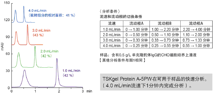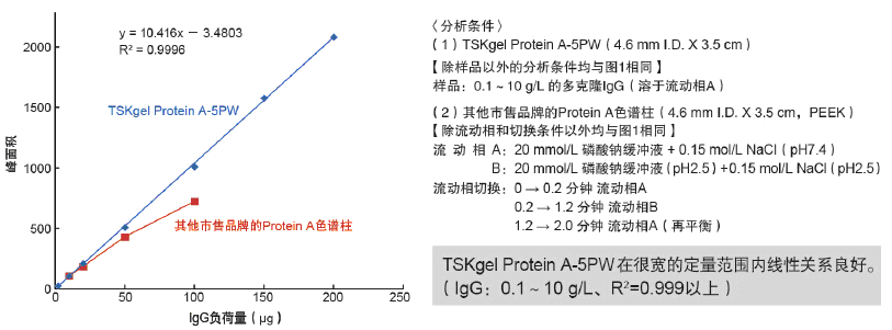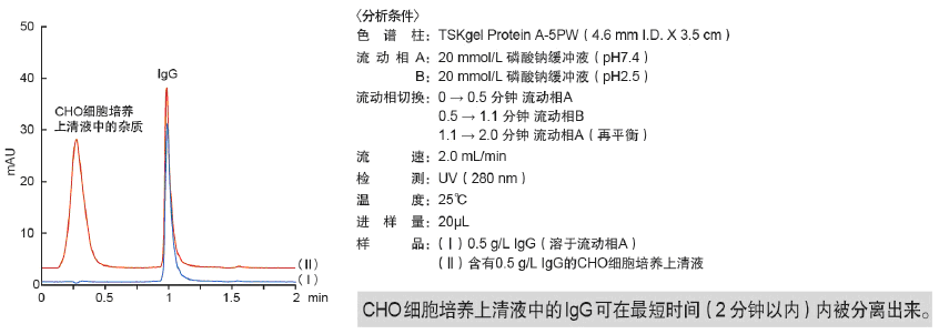 目前,人們對以免疫球蛋白(IgG)為主的抗體藥物的需求日益高漲。在抗體藥物的研發(fā)以及制備工藝建設(shè)中,由于IgG表達需進行篩選,所以必須快速及準(zhǔn)確地定量細(xì)胞培養(yǎng)液中的IgG。而且,即使在工業(yè)制備過程中,IgG的定量也是重要的質(zhì)量控制項目之一。為此,日本東曹公司特推出以多孔親水性聚合物為基質(zhì),表面鍵合有重組Protein A官能團的TSKgel Protein A-5PW親和色譜柱,用于IgG的快速、高分離度分析。
