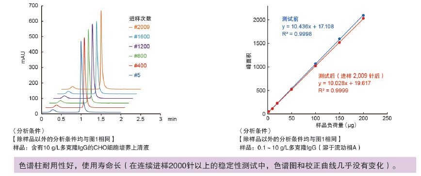 4. 連續(xù)進樣測試中的色譜圖以及進樣測試前后的IgG校正曲線