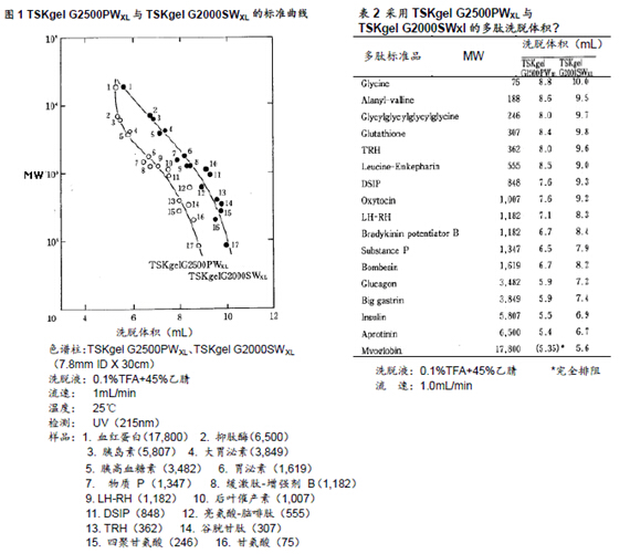 一般情況下,采用GFC法分離多肽所使用的填充劑多為TSKgel的SW硅膠型填料而非TSKgel的PW樹脂型填料。本文中將針對(duì)這些填充劑(TSKgel G2000SWXL以及TSKgel G2500PWXL)在多肽分離的應(yīng)用上進(jìn)行探討。
