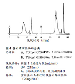 圖4所示為分離基因重組ProteinA的TRCK-胰蛋白酶消化物的實(shí)例。樣品中含有與蛋白質(zhì)消化物分子量不同的各類多肽。如上所示,由于TSKgel G2000SWXL色譜柱的分離范圍較寬,其分離效果也更好。(該樣品通過(guò)RPC分析的結(jié)果,可觀察到約有60種多肽峰在RPC下被檢測(cè)到)。