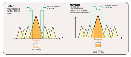 Contichrom層析系統(tǒng)所特有的MCSGP功能(Multicolumn Countercurrent Solvent Gradient Purification),可將目標(biāo)產(chǎn)物與雜質(zhì)的重疊部分回收,進(jìn)行循環(huán)式的層析操作,從而最大限度地提純產(chǎn)品,使得純度和收率二者兼得。運(yùn)行MCSGP功能時(shí),各cycle僅將最純組分收作目標(biāo)產(chǎn)物,從而保證了高純度;各cycle均將重疊部分進(jìn)行回收再上樣,從而保證了高收率。
