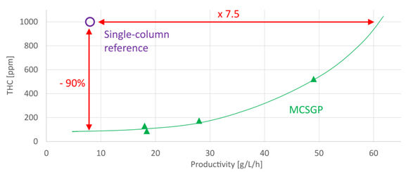 MCSGP可用于不同工藝要求。如果對目標(biāo)產(chǎn)品的純度要求并不高,采用MCSGP可使產(chǎn)率進一步提高。比如某企業(yè)要求THC含量上限為1000 ppm時,收率水平不得低于85%,用MCSGP代替單柱層析后,產(chǎn)率由原來的8 g/L/h提高到了60 g/L/h以上。而另一工藝情況為,當(dāng)從單柱層析轉(zhuǎn)換為MCSGP時,保持產(chǎn)率不變,雜質(zhì)THC含量可從1000 ppm降低至100 ppm。見圖12純度 - 產(chǎn)率曲線。