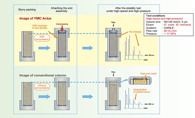 1. 應(yīng)用動態(tài)軸向壓縮柱技術(shù)的制備用填充柱,在柱端裝備時進(jìn)行適度加壓。因此,裝填密度比過去的產(chǎn)品約上升10%。