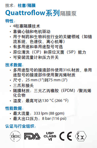 uattroflow的產(chǎn)品需要主要供應(yīng)于密封性好、純度高、無菌的制藥業(yè)和生物技術(shù)產(chǎn)業(yè)。Quattroflow的容積式泵產(chǎn)品采用無機(jī)械密封的四活塞隔膜技術(shù),該泵由一個(gè)偏心軸桿及發(fā)動(dòng)機(jī)驅(qū)動(dòng)。