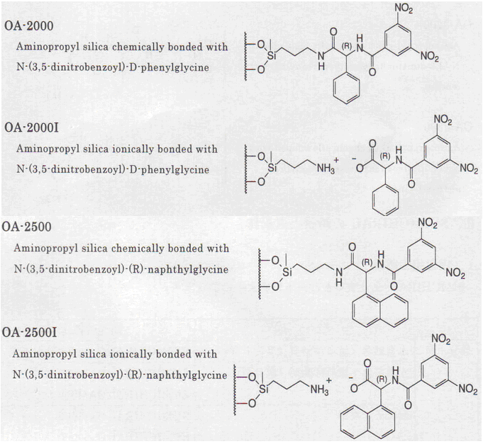 Pirkle改良型 氨基酸的萘乙胺衍生物 | OA-4000 | (S)-纈氨酸 (S)-1-(α-萘基)乙胺 | OA-4000R | 正相 |