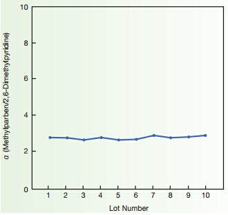 上圖所示,顯示了對(duì)羥基苯甲酸甲酯/2,6-二甲基吡啶(Methylparaben/2,6-Dimethylpyridine)在YMC-Pack ODS-AM液相色譜柱上10次的分離因子(α)。YMC公司在生產(chǎn)過(guò)程中采用的嚴(yán)格質(zhì)量控制體系,以保證產(chǎn)品生產(chǎn)批間的差異最小,提供高再現(xiàn)性的堿性化合物分析柱。